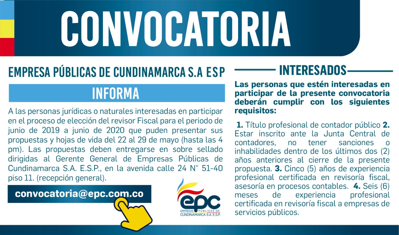 A las personas jurídicas o naturales interesadas en particiapar en el proceso de elección del revisor Fiscal para el periodo de junio de 2019 a junio de 2020 que puden presentar sus propuestas y hojas de vida desde el 31 mayo al 5 de junio (hasta las 4 p.m.).