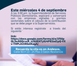 Este miércoles 4 de septiembre a las 3:30 la Superintendente de Servicios Públicos Domiciliarios, explicará y conversará con las empresas vigiladas y gremios sectoriales sobre el cálculo de la contribución que se debe pagar a la