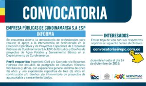Cundinamarca, martes 11 de 2018 Se encuentra abierta la convocatoria de profesionales para realizar el Apoyo a la Interventoría de Preinversión en la Dirección Operativa y de Proyectos Especiales de #Epc, de Estudios y Diseños