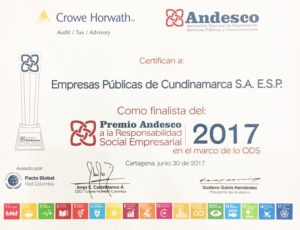 Bogotá Junio 30 de 2017. Empresas Públicas de Cundinamarca S.A. – ESP, fue galardonada como finalista en la categoría de “EMPRESA PEQUEÑA DE SERVICIOS PÚBLICOS Y COMUNICACIONES”, reconocimiento recibido por la Ingeniera Nidia Riaño Subgerente