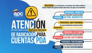– Por favor no espere al ultimo día, radique sus cuentas de cobro y facturas antes de las fechas mensuales de cierre de pagos de recursos PDA. Recuerda que la radicación es únicamente al correo