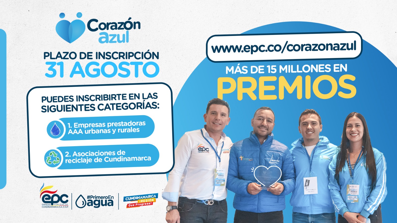 Empresas Públicas de Cundinamarca, anunció el lanzamiento de la segunda versión del premio CORAZÓN AZUL, con el objetivo de reconocer el compromiso, esfuerzo y dedicación de las personas, empresas prestadoras u oficinas de servicios públicos.