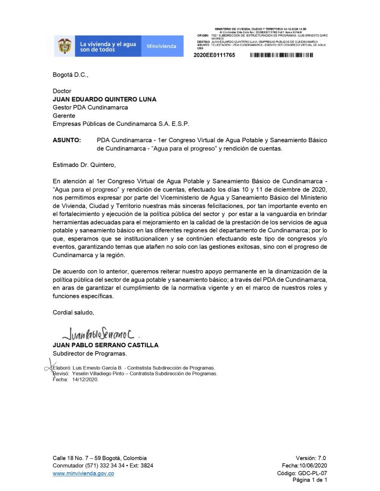 Juan Pablo Serrano Castilla, subdirector de programas del Viceministerio de Agua y Saneamiento Básico reconoció a través de una carta la importancia del evento realizado por EPC con el que se fortalece la política pública del sector y por estar a la vanguardia en brindar herramientas adecuadas para el mejoramiento en la calidad de la prestación de los servicios de agua potable y saneamiento básico en las diferentes regiones del departamento de Cundinamarca.
